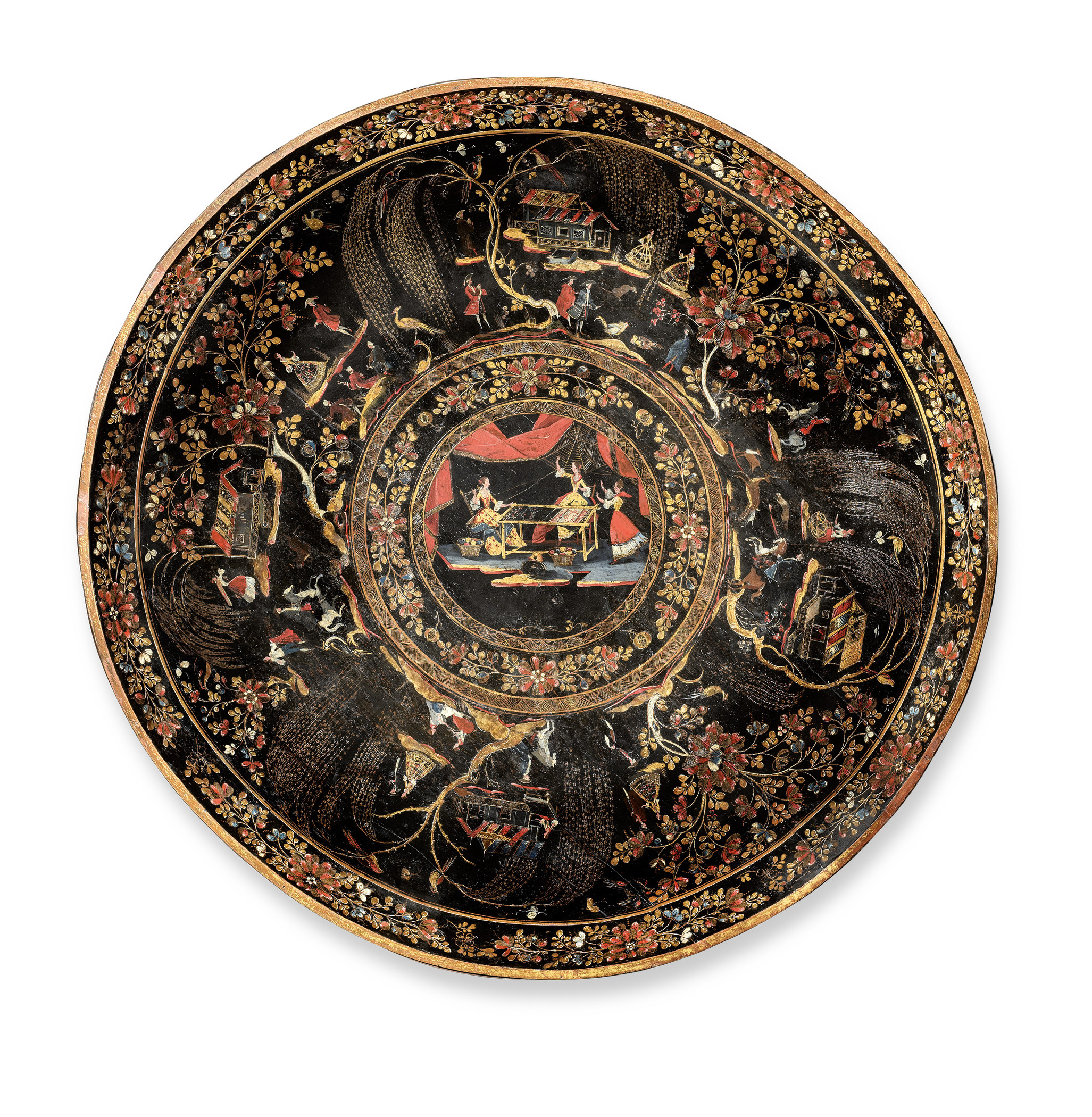 - Circular tray made of Michoacán lacquer and decorated with chicnoiserie scenes of daily life.